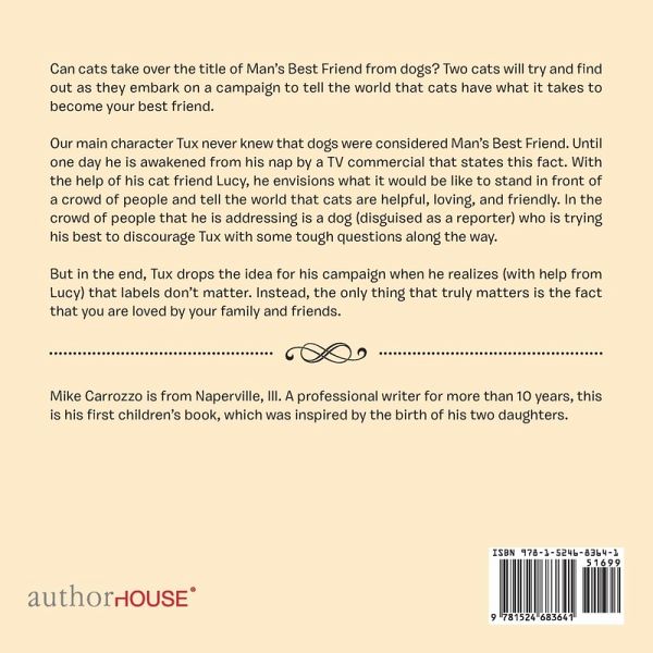 Can cats take over the title of Man’s Best Friend from dogs? Two cats will try and find out as they embark on a campaign to tell the world that cats have what it takes to become your best friend. Our main character Tux never knew that dogs were considered Man’s Best Friend. Until one day he is awakened from his nap by a TV commercial that states this fact. With the help of his cat friend Lucy, he envisions what it would be like to stand in front of a crowd of people and tell the world that cats are helpful, loving, and friendly. In the crowd of people that he is addressing is a dog (disguised as a reporter) who is trying his best to discourage Tux with some tough questions along the way. But in the end, Tux drops the idea for his campaign when he realizes (with help from Lucy) that labels don’t matter. Instead, the only thing that truly matters is the fact that you are loved by your family and friends.