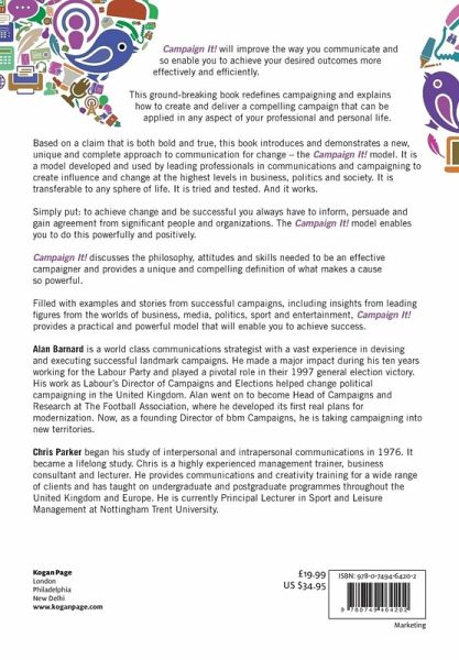 This ground-breaking book redefines campaigning and explains how to create and deliver a compelling campaign that can be applied in any aspect of your professional and personal life. Based on a claim that is both bold and true, this book introduces and demonstrates a new, unique and complete approach to communication for change - the Campaign It! model. It is a model developed and used by leading professionals in communications and campaigning to create influence and change at the highest levels business, politics and society. It is transferable to any sphere of life. It is tried and tested. And it works. Simply put: to achieve change and be successful you always have to inform, persuade and gain agreement from significant people and organizations. The Campaign It! model enables you to do this powerfully and positively.
