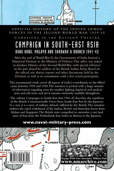 This monumental work covers all aspects of India's contribution to the Allied cause between 1939 and 1945. The narrative is packed with a huge amount of information regarding even the smallest fighting, logistical and medical units and sub-units, and yet it remains eminently readable throughout. The volume Campaigns in South-East Asia 1941-42 describes the expulsion of the British Commonwealth Forces from South-East Asia by the Japanese. In a way it is a story of military debacle suffered by the British. The narrative outlines the rapid withdrawal of the Indian, British and Australian forces from Malaya and Singapore. The British were compelled to surrender a vast land mass of Asia from the Netherlands East Indies to Burma to the Japanese. The region covered extends from Hong Kong to Malaya, including Borneo, Singapore and parts of Burma, and highlights the British and Dutch colonies. The strategic importance of the region to Japan and the Allies, the historical background of the conflict and the prevailing situation in China and Indochina provide the curtain raiser. The impact of terrain and climate on the operations, strengths of the opposing forces, strategies adopted by the two adversaries and the prevailing local political environment are all well covered. Though the Commonwealth Forces had numerical superiority, they were outmatched. This defeat greatly shattered the British and Commonwealth confidence and prestige in the region, which gave impetus to better planning in future operations.