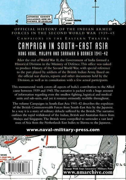 This monumental work covers all aspects of India's contribution to the Allied cause between 1939 and 1945. The narrative is packed with a huge amount of information regarding even the smallest fighting, logistical and medical units and sub-units, and yet it remains eminently readable throughout. The volume Campaigns in South-East Asia 1941-42 describes the expulsion of the British Commonwealth Forces from South-East Asia by the Japanese. In a way it is a story of military debacle suffered by the British. The narrative outlines the rapid withdrawal of the Indian, British and Australian forces from Malaya and Singapore. The British were compelled to surrender a vast land mass of Asia from the Netherlands East Indies to Burma to the Japanese. The region covered extends from Hong Kong to Malaya, including Borneo, Singapore and parts of Burma, and highlights the British and Dutch colonies. The strategic importance of the region to Japan and the Allies, the historical background of the conflict and the prevailing situation in China and Indochina provide the curtain raiser. The impact of terrain and climate on the operations, strengths of the opposing forces, strategies adopted by the two adversaries and the prevailing local political environment are all well covered. Though the Commonwealth Forces had numerical superiority, they were outmatched. This defeat greatly shattered the British and Commonwealth confidence and prestige in the region, which gave impetus to better planning in future operations.