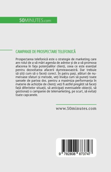 Prospectarea telefonic¿ este o strategie de marketing care are rolul de a v¿ m¿ri agenda de adrese ¿i de a v¿ promova afacerea în fäa poten¿ialilor clien¿i, ceea ce este esen¿ial pentru dezvoltarea afacerii dumneavoastr¿. Dar trebuie s¿ ¿ti¿i cum s¿ o face¿i corect. În patru päi, al¿turi de numeroase sfaturi ¿i metode, ve¿i înv¿¿a cum s¿ pune¿i toate ¿ansele de partea dvs. pentru a maximiza performan¿a în materie de achizi¿ie de clien¿i; ve¿i fi astfel preg¿tit s¿ face¿i fä¿ diferitelor situäii, s¿ anticipäi eventualele obiec¿ii, s¿ gestionäi o campanie de telemarketing, pe scurt, s¿ evitäi toate capcanele.