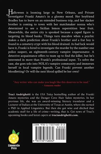 Franki's back-with a bite! Halloween is looming large in New Orleans, and Private Investigator Franki Amato's in a gloomy mood. Her boyfriend Bradley has to leave on an extended business trip, and her slacker brother is coming to town with her matchmaker nonna who's determined to see a Sicilian lemon superstition bear fruit. Meanwhile, the entire city is spooked because a caped figure is targeting its blood banks. Things turn macabre when a psychic makes a dark prediction about Franki's brother and a frat boy is found in a cemetery crypt with his blood drained. As bad luck would have it, Franki is hired to investigate the murder by the number one police suspect, an eighteenth-century vampire impersonator. A detective acquaintance offers to team up to find the killer, but he's interested in more than Franki's professional input. To solve the case, she goes solo into NOLA's vampire community and immerses herself in local vampire legends. Can Franki prevent another bloodletting? Or will the next blood spilled be her own? Campari Crimson is book 4 in the Franki Amato Mysteries, but it can be read as a standalone. If you like zany characters and laugh-out-loud humor with a splash of suspense, then you'll drink up this fun series by USA Today Bestselling Author Traci Andrighetti. Cheers! FRANKI AMATO MYSTERIES: Limoncello Yellow (book 1) Prosecco Pink (book 2) Amaretto Amber (book 3) Campari Crimson (book 4) Galliano Gold (book 5) Marsala Maroon (book 6) Valpolicella Violet (book 7) Nocino Noir (a novella) Tuaca Tan (book 8) Nocino Noir (book 9) Braulio Brown (Thanksgiving novella) Sambuca Scarlet (book 10) ¿To find out what Franki's up to between the books, join Traci's newsletter on her website to get the Franki Amato Mini Mysteries!
