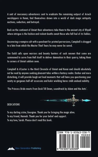 A unit of mercenary adventurers sent to eradicate the remaining outpost of Arioch worshippers in Kenai, find themselves drawn into a world of dark magic antiquity auctions, seduction, and betrayal. Back on the continent of Umiat their adventures take them to the ancient city of Rhyell where intrigue is the fashion and violent deaths await those who fall foul of its foibles. Uncovering a vampire cult with a penchant for printed perversions, Campbell is dragged to a fate from which the Master Thief fears he may never be saved. The Guild calls upon warriors and bounty hunters of such renown that some are summoned to serve from Hell itself to deliver damnation to their quarry, taking them to corners of Umiat seldom seen. Campbell & A'Lastor is the third Chronicle of Umiat and Kenai and should absolutely not be read by anyone seeking pleasant tales within a fantasy realm. Darker and more disturbing, it will provide laugh out loud moments that will have you questioning your sanity as gorgeous half-elf assassins and kukri wielding hares stalk undead nobility. 'The Princess Bride meets From Dusk Till Dawn, soundtrack by Adam and the Ants'.