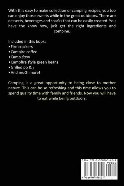 With this easy to make collection of camping recipes, you too can enjoy those sweets while in the great outdoors. There are desserts, beverages and snacks that can be easily created. You have the know how, just get the right ingredients and combine. Included in this book: · Fire crackers · Campire coffee · Camp stew · Campfire style green beans · Grilled pb & j · And much more! Camping is a great opportunity to being close to mother nature. This can be so refreshing and this time allows you to spend quality time with family and friends. Now you will have to eat while being outdoors.