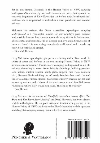 Set in and around Cessnock in the Hunter Valley of NSW, camping underground is a brutal, lyrical and cinematic narrative that lays out the scattered fragments of Kelly Edwards's life before and after the political violence she is implicated in unleashes a viral pandemic and societal collapse. McLaren has written the Great Australian Apocalypse. camping underground is a vernacular lament for our country's past, present and possible futures, but it never succumbs to cynicism: it feels urgent, affectionate, and beautiful, full of despair and love and a biting sense of humour. I read it in one sitting, completely spellbound, and it made my heart both shrink and stretch. - Fiona McFarlane Greg McLaren's apocalyptic epic poem is a daring and brilliant work. In twists of afters and befores in the coal mining Hunter Valley in NSW, atrocities seem 'normal'. Families are 'camping underground' in an old colliery, sheltering in terror from drive-by shootings, bullying patriots, lone actors, nuclear reactor bomb plots, snipers, race riots, zoonotic virii, distorted limbs sticking out of sandy beaches that mock the end times weather. Human survival has become utterly perilous yet sex and sensuality endure and ribbons of dark wit wrap around familial losses. "Cessnock, where else/ would you stage/ the end of the world?" - Pam Brown