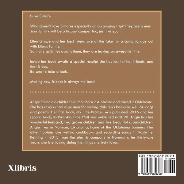 Give S'more Who doesn't love S'mores especially on a camping trip? They are a must! Your tummy will be a happy camper too, just like you. Ellen Grape and her best friend are at the lake for a camping day out with Ellen's family. So many activities awaits them, they are having an awesome time. Inside her book awaits a special receipt she has just for her friends, and that is you. Be sure to take a look. Making new friends is always the best!