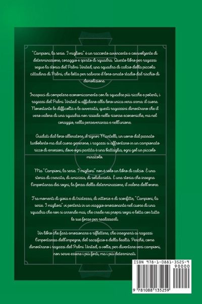 "Campioni, la serie. I migliori" è un racconto avvincente e coinvolgente di determinazione, coraggio e spirito di squadra. Questo libro per ragazzi segue la storia del Palmi United, una squadra di calcio della piccola cittadina di Palmi, che lotta per salvare il loro amato stadio dal rischio di demolizione. Incapaci di competere economicamente con le squadre più ricche e potenti, i ragazzi del Palmi United si affidano alla loro unica vera arma: il cuore. Nonostante le difficoltà e le avversità, questi ragazzini dimostrano che il vero valore di una squadra non risiede nelle risorse economiche, ma nel coraggio, nella perseveranza e nell'unione. Guidati dal loro allenatore, il signor Martelli, un uomo dal passato turbolento ma dal cuore generoso, i ragazzi si affrontano in un campionato ricco di emozioni, dove ogni partita è una battaglia, ogni gol un piccolo miracolo. Ma "Campioni, la serie. I migliori" non è solo un libro di calcio. È una storia di crescita, di amicizia, di solidarietà. È una storia che insegna l'importanza dei sogni, la forza della determinazione, il valore dell'onore. Tra momenti di gioia e di tristezza, di vittorie e di sconfitte, "Campioni, la serie. I migliori" vi porterà in un viaggio emozionante nel cuore di una squadra che non si arrende mai, che crede nei propri sogni e lotta con tutte le sue forze per realizzarli. Un libro che farà emozionare e riflettere, che insegnerà ai ragazzi l'importanza dell'impegno, del sacrificio e della lealtà. Perché, come dimostrano i ragazzi del Palmi United, a volte, per diventare veri campioni, non serve essere i più forti, ma i più determinati.