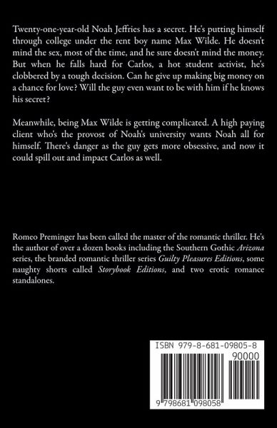 Twenty-one-year-old Noah Jeffries has a secret. He's putting himself through college under the rent boy name Max Wilde. He doesn't mind the sex, most of the time, and he sure doesn't mind the money. But when he falls hard for Carlos, a hot student activist, he's clobbered by a tough decision. Can he give up making big money on a chance for love? Will the guy even want to be with him if he knows his secret? Meanwhile, being Max Wilde is getting complicated. A high paying client who's the provost of Noah's university wants Noah all for himself. There's danger as the guy gets more obsessive, and now it could spill out and impact Carlos as well. The first title in Romeo Preminger's Guilty Pleasures series of erotic thrillers.