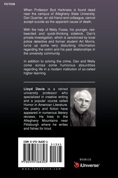 When Professor Bud Harkness is found dead near the campus of Allegheny State University, Dan Quarrier, an old friend and colleague, cannot accept suicide as the apparent cause of death. With the help of Wally Fosse, his younger, red-bearded and quick-thinking sidekick, Dan's private investigation, which is sanctioned by local police detective and former student Art Morris, turns up some very disturbing information regarding the victim and his past relationships in the university community. In addition to solving the crime, Dan and Wally come across some humorous absurdities regarding life in a modern institution of so-called higher learning.