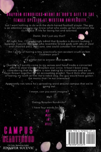 From USA Today bestselling author Jennifer Sucevic comes a sexy, new adult college sports romance.Brayden Kendricks might be God's gift to the female species at Western University, but I want nothing to do with the dark-haired football player. The guy is an attention seeking you-know-what who soaks up fan adoration like it's his due in life for being hot and talented. Damn. Did I just say that? All right, fine...I'll grudgingly admit that Brayden is decent looking. I suppose if you're into guys who resemble Greek gods with abs of steel and chiseled pecs, then sure, one could consider him attractive. Am I guilty of having a tiny, practically non-existent crush on him freshman year? I'd prefer not to answer that question. Thankfully, I quickly came to my senses and have made a concerted effort to steer clear of Brayden ever since. It hasn't been easy, considering that my bestie is now dating his roommate and we've been thrown together for an accounting project. You'd think after years of baring my teeth at him like a rabid dog, the guy would have gotten the memo that I'm not interested. Apparently not, since he's spreading word around campus that we're going out. I mean, can you even imagine? Me? Dating Brayden Kendricks? I have four words for him... No. Way. In. Hell.
