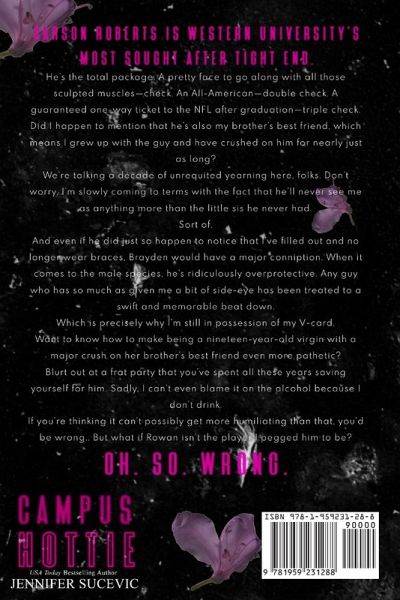 From USA Today bestselling author Jennifer Sucevic comes a sexy new adult, college sports romance. Carson Roberts is Western University's most sought after tight end. He's the total package. A pretty face to go along with all those sculpted muscles-check. An All-American-double check. A guaranteed one-way ticket to the NFL after graduation-triple check. Did I happen to mention that he's also my brother's best friend, which means I grew up with the guy and have crushed on him for nearly just as long? We're talking a decade of unrequited yearning. Don't worry, I'm slowly coming to terms with the fact that he'll never see me as anything more than the little sis he never had. Sort of. And even if he did just so happen to notice that I've filled out and no longer wear braces, Brayden would have a major conniption. When it comes to the male species, he's ridiculously overprotective. Any guy who has so much as given me a bit of side-eye has been treated to a swift and memorable beat down. Which is precisely why I'm still in possession of my V-card. Want to know how to make being a nineteen-year-old virgin with a major crush on her brother's best friend even more pathetic? Blurt out at a frat party that you've spent all these years saving yourself for him. If you're thinking it can't possibly get more humiliating than that, you'd be wrong. Oh. So. Wrong.