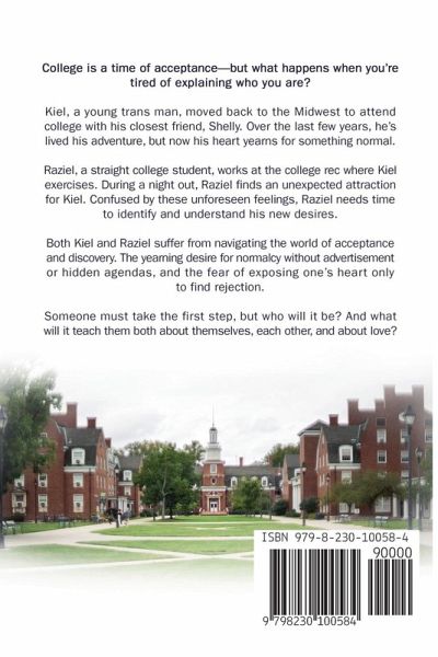 College is a time of acceptance-but what happens when you're tired of explaining who you are? Kiel, a young trans man, moved back to the Midwest to attend college with his closest friend, Shelly. Over the last few years, he's lived his adventure, but now his heart yearns for something normal. Raziel, a straight college student, works at the college rec where Kiel exercises. During a night out, Raziel finds an unexpected attraction for Kiel. Confused by these unforeseen feelings, Raziel needs time to identify and understand his new desires. Both Kiel and Raziel suffer from navigating the world of acceptance and discovery. The yearning desire for normalcy without advertisement or hidden agendas, and the fear of exposing one's heart only to find rejection. Someone must take the first step, but who will it be? And what will it teach them both about themselves, each other, and about love?