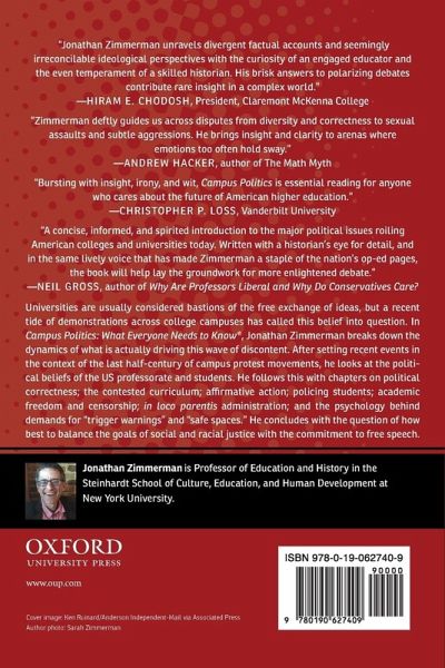Universities are usually considered bastions of the free exchange of ideas, but a recent tide of demonstrations across college campuses has called this belief into question, and with serious consequences. Such a wave of protests hasn't been seen since the campus free speech demonstrations of the 1960s, yet this time it is the political Left, rather than the political Right, calling for restrictions on campus speech and freedom. And, as Jonathan Zimmerman suggests, recent campus controversies have pitted free speech against social justice ideals. The language of trauma--and, more generally, of psychology--has come to dominate campus politics, marking another important departure from prior eras. This trend reflects an increased awareness of mental health in American society writ large. But it has also tended to dampen exchange and discussion on our campuses, where faculty and students self-censor for fear of insulting or offending someone else. Or they attack each other in periodic bursts of invective, which run counter to the "civility" promised by new speech and conduct codes. In Campus Politics: What Everyone Needs to Know®, Jonathan Zimmerman breaks down the dynamics of what is actually driving this recent wave of discontent. After setting recent events in the context of the last half-century of free speech campus movements, Zimmerman looks at the political beliefs of the US professorate and students. He follows this with chapters on political correctness; debates over the contested curriculum; admissions, faculty hires, and affirmative action; policing students; academic freedom and censorship; in loco parentis administration; and the psychology behind demands for "trigger warnings" and "safe spaces." He concludes with the question of how to best balance the goals of social and racial justice with the commitment to free speech.