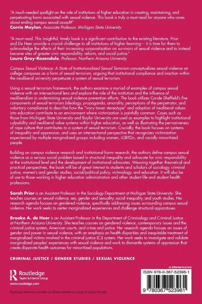 "Campus Sexual Violence: A State of Institutionalized Sexual Terrorism is a must-read for anyone concerned about the insidious prevalence of sexual violence- and rape culture altogether- on our university campuses. This insightful, timely book is a significant contribution to the existing literature. Drawing upon the important concepts of sexual terrorism and intersectionality, Prior and De Heer provide a crucial challenge to all institutions of higher learning- it is time for them to acknowledge the effects of their increasing corporatization on survivors of sexual violence and to instead become sites of greater civic responsibility, reform, and social justice. Campus Sexual Violence promises to have relevance across a wide variety of academic fields and disciplines. And, I believe that it will also have far-reaching impacts outside of the academy in the years to come."