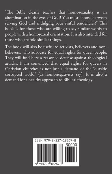 "The Bible clearly teaches that homosexuality is an abomination in the eyes of God! You must choose between serving God and indulging your sinful tendencies!" This book is for those who are willing to say similar words to people with a homosexual orientation. It is also intended for those who are told similar things. The book will also be useful to activists, believers and non-believers, who advocate for equal rights for queer people. They will find here a reasoned defense against theological attacks. I am convinced that equal rights for queers in Christian churches is not just a demand of the "outside corrupted world" (as homonegativists say). It is also a demand for a healthy approach to Biblical theology.
