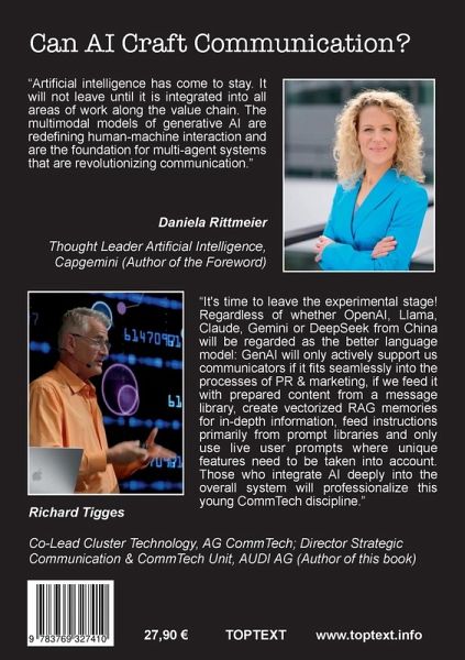 Can AI craft communication? And how do you get a company to the forefront of the Generative AI (GenAI) movement or at least among the fast followers? At the moment, there are actually far more communication professionals dealing with this question than would like to admit. In this guide, Richard Tigges, experienced radio and TV journalist and CommTech PR strategist, takes away the fear of taking the first (or second) step. The book is a concrete guide on how to introduce artificial intelligence into your PR or marketing department quickly, efficiently and, above all, in a meaningful way. There are quick wins and long-term, strategic decisions that will pay off.