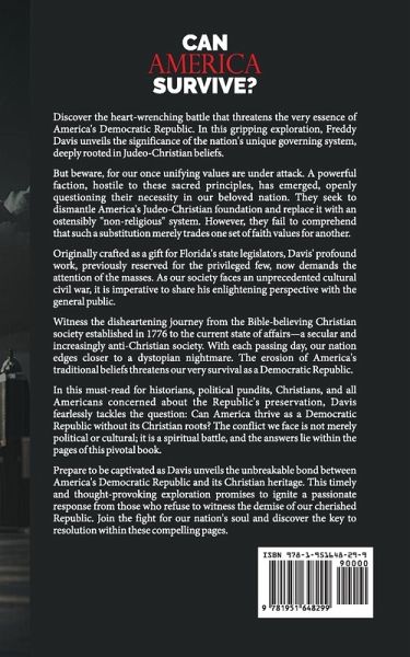 Discover the heart-wrenching battle that threatens the very essence of America's Democratic Republic. In this gripping exploration, Freddy Davis unveils the significance of the nation's unique governing system, deeply rooted in Judeo-Christian beliefs. But beware, for our once unifying values are under attack. A powerful faction, hostile to these sacred principles, has emerged, openly questioning their necessity in our beloved nation. They seek to dismantle America's Judeo-Christian foundation and replace it with an ostensibly "non-religious" system. However, they fail to comprehend that such a substitution merely trades one set of faith values for another. Originally crafted as a gift for Florida's state legislators, Davis' profound work, previously reserved for the privileged few, now demands the attention of the masses. As our society faces an unprecedented cultural civil war, it is imperative to share his enlightening perspective with the general public. Witness the disheartening journey from the Bible-believing Christian society established in 1776 to the current state of affairs-a secular and increasingly anti-Christian society. With each passing day, our nation edges closer to a dystopian nightmare. The erosion of America's traditional beliefs threatens our very survival as a Democratic Republic. In this must-read for historians, political pundits, Christians, and all Americans concerned about the Republic's preservation, Davis fearlessly tackles the question: Can America thrive as a Democratic Republic without its Christian roots? The conflict we face is not merely political or cultural; it is a spiritual battle, and the answers lie within the pages of this pivotal book. Prepare to be captivated as Davis unveils the unbreakable bond between America's Democratic Republic and its Christian heritage. This timely and thought-provoking exploration promises to ignite a passionate response from those who refuse to witness the demise of our cherished Republic. Join the fight for our nation's soul and discover the key to resolution within these compelling pages.