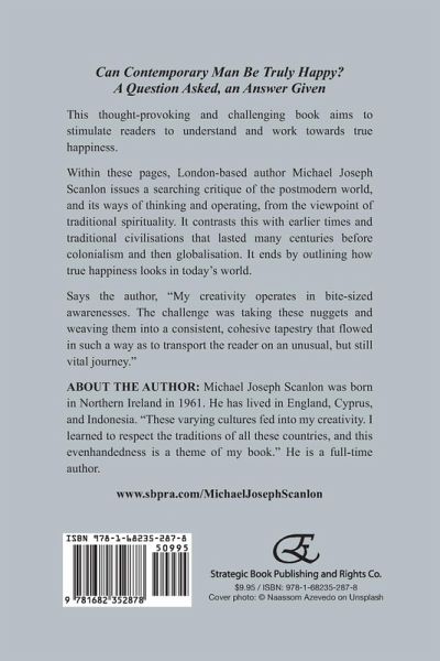 This thought-provoking and challenging book aims to stimulate readers to understand and work towards true happiness. Within these pages, London-based author Michael Joseph Scanlon issues a searching critique of the postmodern world, and its ways of thinking and operating, from the viewpoint of traditional spirituality. It contrasts this with earlier times and traditional civilisations that lasted many centuries before colonialism and then globalisation. It ends by outlining how true happiness looks in today's world. Says the author, "My creativity operates in bite-sized awarenesses. The challenge was taking these nuggets and weaving them into a consistent, cohesive tapestry that flowed in such a way as to transport the reader on an unusual, but still vital journey." About the Author: Michael Joseph Scanlon was born in Northern Ireland in 1961. He has lived in England, Cyprus, and Indonesia. "These varying cultures fed into my creativity. I learned to respect the traditions of all these countries, and this evenhandedness is a theme of my book." He is a full-time author.