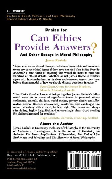 Esteemed moral philosopher James Rachels here collects fifteen essays, some classic and others extensively revised, on the nature and limits of moral reasoning. Rachels argues that, rather than simply expressing societal conventions, moral philosophy can subvert received opinion and replace it with something better. Combining a concern for ethical theory with a discussion of practical moral issues such as euthanasia, the rights of animals, privacy, and affirmative action. Can Ethics Provide Answers is an excellent collection for students, scholars, and anyone concerned with the degree to which our principles can guide our policies.