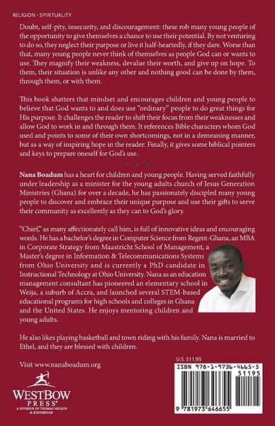 Doubt, self-pity, insecurity, and discouragement: these rob many young people of the opportunity to give themselves a chance to use their potential. By not venturing to do so, they neglect their purpose or live it half-heartedly, if they dare. Worse than that, many young people never think of themselves as people God can or wants to use. They magnify their weakness, devalue their worth, and give up on hope. To them, their situation is unlike any other and nothing good can be done by them, through them, or with them. This book shatters that mindset and encourages children and young people to believe that God wants to and does use "ordinary" people to do great things for His purpose. It challenges the reader to shift their focus from their weaknesses and allow God to work in and through them. It references Bible characters whom God used and points to some of their own shortcomings, not in a demeaning manner, but as a way of inspiring hope in the reader. Finally, it gives some biblical pointers and keys to prepare oneself for God's use.