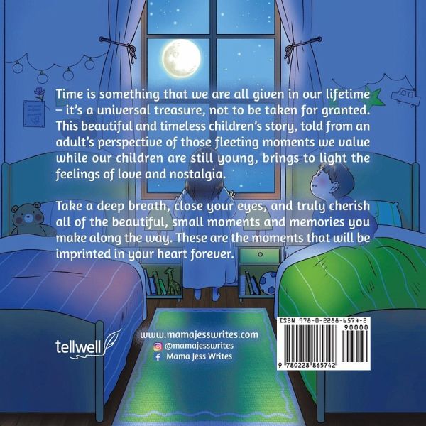 Time is something that we are all given in our lifetime - it's a universal treasure, not to be taken for granted. This beautiful and timeless children's story, told from an adult's perspective of those fleeting moments we value while our children are still young, brings to light the feelings of love and nostalgia. Take a deep breath, close your eyes, and truly cherish all of the beautiful, small moments and memories you make along the way. These are the moments that will be imprinted in your heart forever.