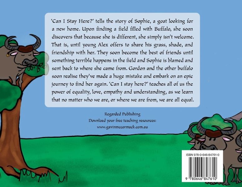 'Can I stay here?' tells the story of Sophie, a goat looking for a new home. Upon finding a field filled with Buffalo, she soon discovers that because she is different, she simply isn't welcome. That is, until young Alex offers to share his grass, shade, and friendship with her. They soon become the best of friends until something terrible happens in the field and Sophie is blamed and sent back to where she came from. Gordon and the other buffalo soon realise they've made a huge mistake and embark on an epic journey to find her again. 'Can I stay here?' teaches all of us the power of equality, love, empathy and understanding, as we learn that no matter who we are, or where we are from, we are all equal.