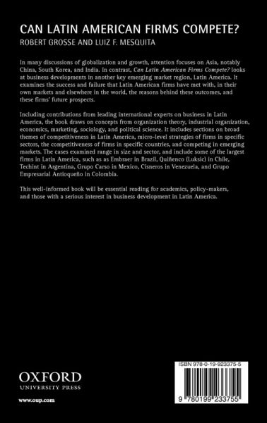 In many discussions of globalization and growth, attention focuses on Asia, notably China, South Korea, and India. In contrast, 'Can Latin American Firms Compete?' looks at business developments in another key emerging market region, Latin America. It examines the success and failure that Latin American firms have met with, in their own markets and elsewhere in the world, the reasons behind these outcomes, and these firms' future prospects. Including contributions from leading international experts on business in Latin America, the book draws on concepts from organization theory, industrial organization, economics, marketing, sociology, and political science. It includes sections on broad themes of competitiveness in Latin America, micro-level strategies of firms in specific sectors, the competitiveness of firms in specific countries, and competing in emerging markets. Cases examined range in size and sector, and include some of the largest firms in Latin America, such as as Embraer in Brazil, Quiñenco (Luksic) in Chile, Techint in Argentina, Grupo Carso in Mexico, Cisneros in Venezuela, and Grupo Empresarial Antioqueño in Colombia. This well-informed book will be essential reading for academics, policy-makers, and those with a serious interest in business development in Latin America.
