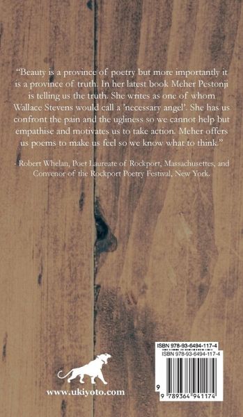 "Beauty is a province of poetry but more importantly it is a province of truth. In her latest book Meher Pestonji is telling us the truth. She writes as one of whom Wallace Stevens would call a 'necessary angel'. She has us confront the pain and the ugliness so we cannot help but empathise and motivates us to take action. Meher offers us poems to make us feel so we know what to think." - Robert Whelan, Poet Laureate of Rockport, Massachusettes, and Convenor of the Rockport Poetry Festival, New York.
