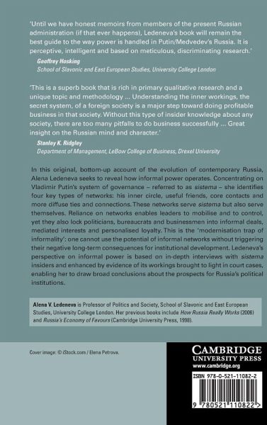 In this original, bottom-up account of the evolution of contemporary Russia, Alena Ledeneva seeks to reveal how informal power operates. Concentrating on Vladimir Putin's system of governance - referred to as sistema - she identifies four key types of networks: his inner circle, useful friends, core contacts and more diffuse ties and connections. These networks serve sistema but also serve themselves. Reliance on networks enables leaders to mobilise and to control, yet they also lock politicians, bureaucrats and businessmen into informal deals, mediated interests and personalised loyalty. This is the 'modernisation trap of informality': one cannot use the potential of informal networks without triggering their negative long-term consequences for institutional development. Ledeneva's perspective on informal power is based on in-depth interviews with sistema insiders and enhanced by evidence of its workings brought to light in court cases, enabling her to draw broad conclusions about the prospects for Russia's political institutions.