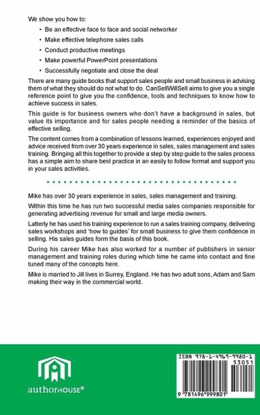 We show you how to: Be an effective face to face and social networker Make effective telephone sales calls Conduct productive meetings Make powerful PowerPoint presentations Successfully negotiate and close the deal There are many guide books that support sales people and small business in advising them of what they should do not what to do. CanSellWillSell aims to give you a single reference point to give you the confidence, tools and techniques to know how to achieve success in sales. This guide is for business owners who don't have a background in sales, but value its importance and for sales people needing a reminder of the basics of effective selling. The content comes from a combination of lessons learned, experiences enjoyed and advice received from over 30 years experience in sales, sales management and sales training. Bringing all this together to provide a step by step guide to the sales process has a simple aim to share best practice in an easily to follow format and support you in your sales activities.