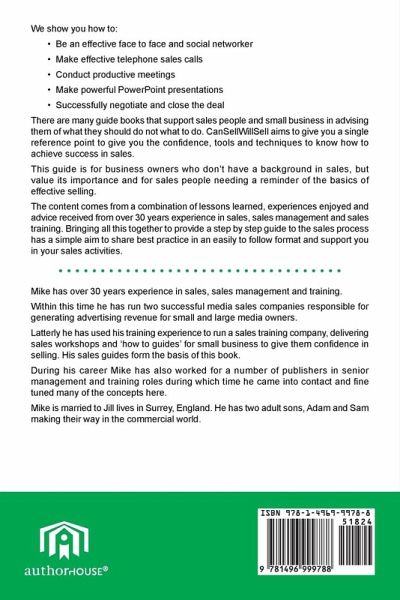 We show you how to: Be an effective face to face and social networker Make effective telephone sales calls Conduct productive meetings Make powerful PowerPoint presentations Successfully negotiate and close the deal There are many guide books that support sales people and small business in advising them of what they should do not what to do. CanSellWillSell aims to give you a single reference point to give you the confidence, tools and techniques to know how to achieve success in sales. This guide is for business owners who don't have a background in sales, but value its importance and for sales people needing a reminder of the basics of effective selling. The content comes from a combination of lessons learned, experiences enjoyed and advice received from over 30 years experience in sales, sales management and sales training. Bringing all this together to provide a step by step guide to the sales process has a simple aim to share best practice in an easily to follow format and support you in your sales activities.