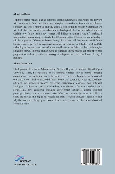 This book brings readers to enter our future technological world to let you to feel how we will encounter in future predictive technological innovation or invention to influence our daily life. This is future US and UK technological fiction to explain what images we will feel when our societies were become technological life. I write this book aims to explain how future technology change will influence human living of standard. I suppose that human living of standard will become better if future human technology will be improved. Otherwise, human living of standard will become worse if future human technology won't be improved , even will be fallen down. I shall give US and UK technologies development past and present evidences to explain how their technologies development will improve human living of standard. I hope readers can make personal judgment to evaluate whether technology development will improve human living of standard.