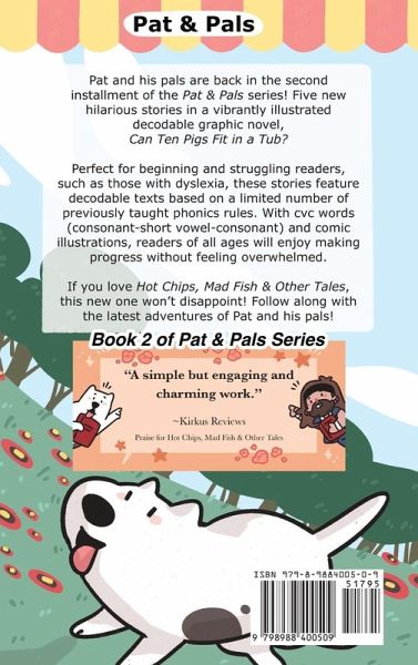 Pat and his pals are back in the second installment of the Pat & Pals series! Five new hilarious stories in a vibrantly illustrated decodable graphic novel, Can Ten Pigs Fit in a Tub? Perfect for beginning and struggling readers, such as those with dyslexia, these stories feature decodable texts based on a limited number of previously taught phonics rules. With cvc words (consonant-short vowel-consonant) and comic illustrations, readers of all ages will enjoy making progress without feeling overwhelmed. If you love Hot Chips, Mad Fish & Other Tales, this new one won't disappoint! Follow along with the latest adventures of Pat and his pals!