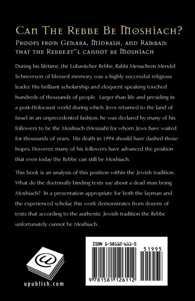 During his lifetime, the Lubavitcher Rebbe, Rabbi Menachem Mendel Schneerson of blessed memory, was a highly successful religious leader. His brilliant scholarship and eloquent speaking touched hundreds of thousands of people. Larger than life and presiding in a post-Holocaust world during which Jews returned to the land of Israel in an unprecedented fashion, he was declared by many of his followers to be the Moshiach (Messiah) for whom Jews have waited for thousands of years. His death in 1994 should have dashed those hopes. However, many of his followers have advanced the position that even today the Rebbe can still be Moshiach. This book is an analysis of this position within the Jewish tradition. What do the doctrinally binding texts say about a dead man being Moshiach? In a presentation appropriate for both the layman and the experienced scholar, this work demonstrates from dozens of texts that according to the authentic Jewish tradition the Rebbe unfortunately cannot be Moshiach.