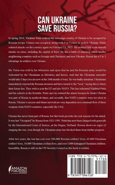 In spring 2014, Vladimir Putin ordered the sovereign country of Ukraine to be occupied by Russian troops. Crimea was occupied, along with 4 or 5 cities in eastern Ukraine. Putin ordered attacks on the country again on February 22, 2022. He ordered full-scale missile attacks on cities, including the capital of Kiev. He has a habit of attacking much smaller neighboring countries such as Georgia and Chechnya, and now Ukraine. Russia has a 5 to 1 advantage in soldiers over Ukraine. Mr. Putin was told by his Ministers and spies that he and the Russian army would be welcomed by the Ukrainians as liberators and heroes. And that the Ukrainian surrender would take 5 days (we are now in the 24th month of war). He was badly mistaken; Ukrainians immediately rejected the Russian invasion and have turned to the "west," saying this is where their future lies. They wish to join the EU and also NATO. This has infuriated Vladimir Putin and his cohorts in the Kremlin. Putin says he ordered the attack because he thinks Ukraine was part of Russia in medieval times, and secondly, that NATO countries were too close to Russia. Ukraine's success and future survival are very dependent on a continual flow of these weapons from NATO countries, especially the USA. Ukraine has never been part of Russia, but this book provides the real reasons for the attack. It was last "Occupied" by Russia from 1921-1991. Putin has now been charged with genocide by the International Court of Justice, at the Hague, Holland. Russia shows no signs of stopping the war, even though the Ukrainian army has blocked them from further progress. After two years, the war has cost over 300,000 Russian soldiers' lives, 65,000 Ukrainian soldiers' lives, 10,000 Ukrainian civilian lives, and over 5,000 kidnapped Ukrainian children. Incredibly, Russia is still on the UN Security Council as this book is written.