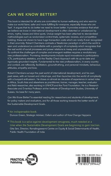 This book is intended for all who are committed to human wellbeing and who want to make our world fairer, safer and more fulfilling for everyone, especially those who are 'last'. It argues that to do better we need to know better. It provides evidence that what we believe we know in international development is often distorted or unbalanced by errors, myths, biases and blind spots. Undue weight has been attached to standardised methodologies such as randomized control trials, systematic reviews, and competitive bidding: these are shown to have huge transaction costs which are rarely if ever recognized in their enormity. Robert Chambers contrasts a Newtonian paradigm in which the world is seen and understood as controllable with a paradigm of complexity which recognizes that the real world of social processes and power relations is messy and unpredictable. To confront the challenges of complex and emergent realities requires a revolutionary new professionalism. This is underpinned by a new combination of canons of rigour expressed through eclectic methodological pluralism and participatory approaches which reverse and transform power relations. Promising developments include rapid innovations in participatory ICTs, participatory statistics, and the Reality Check Approach with its up-to-date and rigorously grounded insights. Fundamental to the new professionalism, in every country and context, are reflexivity, facilitation, groundtruthing, and personal mindsets, behaviour, attitudes, empathy and love. Robert Chambers surveys the past world of international development, and his own past views, with an honest and critical eye, and then launches into the world of complexity with a buoyant enthusiasm. He draws on almost six decades of experience in varied roles in Africa, South Asia and elsewhere as practitioner, trainer, manager, teacher, evaluator and field researcher, also working in UNHCR and the Ford Foundation. He is a Research Associate and Emeritus Professor at the Institute of Development Studies, University of Sussex, his base for many years.
