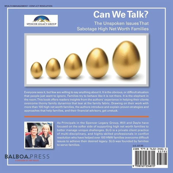 Everyone sees it, but few are willing to say anything about it. It is the obvious, or difficult situation that people just want to ignore. Families try to behave like it is not there. It is the elephant in the room. "Can We Talk? The Unspoken Issues That Challenge High Net Worth Families," offers readers insights from the authors' experience in helping their clients overcome thorny family dynamics that tear at the family fabric. Drawing on their work with more than 100 high net worth families, the authors introduce and explain proven strategies and approaches that help families, and their financial advisors, get unstuck.