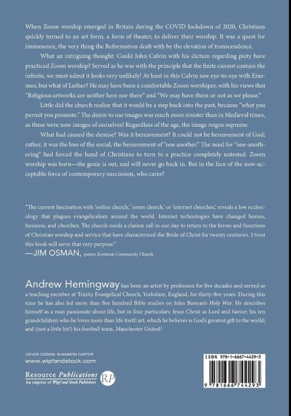 When Zoom worship emerged in Britain during the COVID lockdown of 2020, Christians quickly turned to an art form, a form of theater, to deliver their worship. It was a quest for immanence, the very thing the Reformation dealt with by the elevation of transcendence. What an intriguing thought: Could John Calvin with his dictum regarding piety have practiced Zoom worship? Served as he was with the principle that the finite cannot contain the infinite, we must admit it looks very unlikely! At least in this Calvin saw eye-to-eye with Erasmus, but what of Luther? He may have been a comfortable Zoom worshiper, with his views that ""Religious artworks are neither here nor there"" and ""We may have them or not as we please."" Little did the church realize that it would be a step back into the past, because ""what you permit you promote."" The desire to use images was much more sinister than in Medieval times, as these were now images of ourselves! Regardless of the age, the image reigns supreme. What had caused the demise? Was it bereavement? It could not be bereavement of God; rather, it was the loss of the social, the bereavement of ""one another."" The need for ""one-anothering"" had forced the hand of Christians to turn to a practice completely untested. Zoom worship was born--the genie is out, and will never go back in. But in the face of the now-acceptable force of contemporary narcissism, who cares?