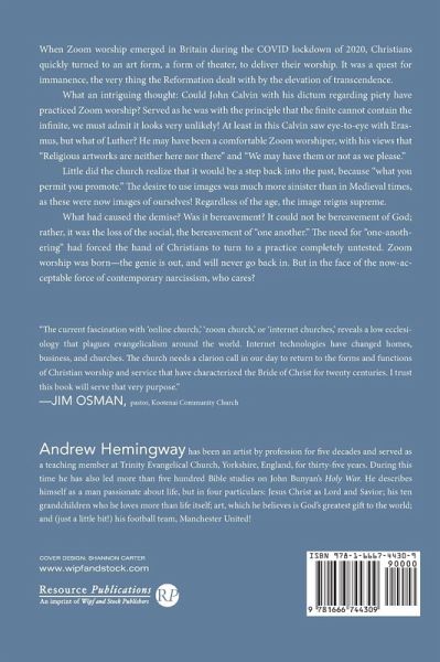 When Zoom worship emerged in Britain during the COVID lockdown of 2020, Christians quickly turned to an art form, a form of theater, to deliver their worship. It was a quest for immanence, the very thing the Reformation dealt with by the elevation of transcendence. What an intriguing thought: Could John Calvin with his dictum regarding piety have practiced Zoom worship? Served as he was with the principle that the finite cannot contain the infinite, we must admit it looks very unlikely! At least in this Calvin saw eye-to-eye with Erasmus, but what of Luther? He may have been a comfortable Zoom worshiper, with his views that ""Religious artworks are neither here nor there"" and ""We may have them or not as we please."" Little did the church realize that it would be a step back into the past, because ""what you permit you promote."" The desire to use images was much more sinister than in Medieval times, as these were now images of ourselves! Regardless of the age, the image reigns supreme. What had caused the demise? Was it bereavement? It could not be bereavement of God; rather, it was the loss of the social, the bereavement of ""one another."" The need for ""one-anothering"" had forced the hand of Christians to turn to a practice completely untested. Zoom worship was born--the genie is out, and will never go back in. But in the face of the now-acceptable force of contemporary narcissism, who cares?