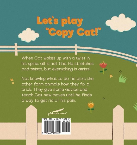 Let's play "Copy Cat!" When Cat wakes up with a twist in his spine, all is not fine. He stretches and twists, but everything is amiss! Not knowing what to do, he asks the other farm animals how they fix a crick. They give some advice and teach Cat new moves until he finds a way to get rid of his pain.