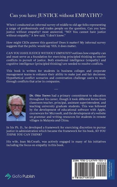 When I conducted an informal survey of middle to old-age folks representing a range of professionals and tradespeople on the question, Can you have justice without empathy? most answered, "NO! You cannot have justice without empathy." A few said, "I don't know." How might CEOs answer this question? Does it matter? My informal survey suggests that the public would say YES, it does matter. CAN YOU HAVE JUSTICE WITHOUT EMPATHY? outlines how empathy can and must serve as a foundation for exercising principled thinking to resolve conflicts in pursuit of justice. Both emotional intelligence (empathy) and cognitive intelligence (principled thinking) are needed to resolve conflicts. This book is written for students in business colleges and corporate management teams to enhance their ability to make just and fair decisions. Hypothetical conflict scenarios and conversation challenge users to work through conflicts that arise in companies.