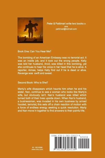Book One: Can You Hear Me? The bombing of an American Embassy was no terrorist act. It was an inside job, and it took out the wrong people. Kelly was told her husband, Ancil, was killed in this bombing, yet she continues to hear his voice in her head that he is alive. A reporter, Aimee, helps Kelly find out if he is dead or alive. Revenge was swift and sweet. Second Book: Who is She? Marty's wife disappears which haunts him when he and his sister, Nan, continue to see a woman who looks like Marty's wife, but obviously isn't. Nan's husband was killed which turned both of their lives upside down. When Nan's husband, a businessman, was invaded in his own business by armed hooded, terrorist; this sets off a chain reaction of motion with a force of endless energy seeking a quick resolution. Marty and Nan move in together to find answers to their painful life.