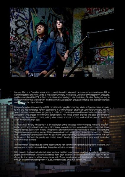 "Can you hear the city whispering? (Winnipeg, MB)" is an exploration of the cityscape within Winnipeg. We've decided to take a tourist-like approach to our current collaboration and include the general public into our research process, by asking them to locate their favourite and disliked place within the city. The information collected has given us the opportunity to visit common and personal geographic locations. Our primary goal was to discover and share these sites with the community.