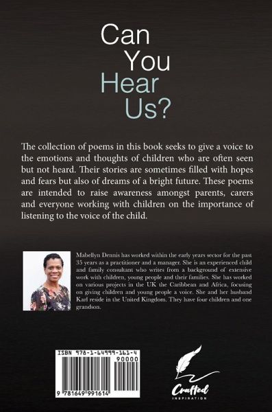 The collection of poems in this book seeks to give a voice to the emotions and thoughts of children who are often seen but not heard. Their stories are sometimes filled with hopes and fears but also of dreams of a bright future. These poems are intended to raise awareness amongst parents, carers and everyone working with children on the importance of listening to the voice of the child. The author, Mabellyn Dennis has worked within the early years sector for the past 35 years as a practitioner and a manager. She is an experienced child and family consultant who writes from a background of extensive work with children, young people and their families. She has worked on various projects in the UK the Caribbean and Africa, focusing on giving children and young people a voice.