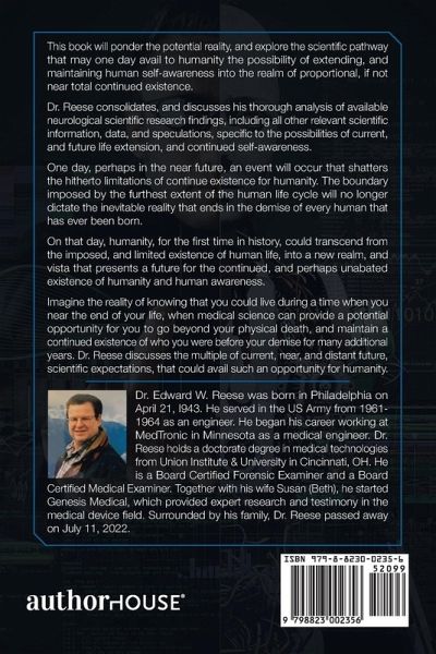 Dr. Reese has long been fascinated with the human aging process and the possibilities of extending human life, and self-awareness beyond its end of life cycle. Therefore, the focus of his book, is based upon understanding the aging process, and possibilities of extending life, and maintaining self-awareness. Following are some highlights from his book: * Can Human Awareness Exist Forever? * The Continued Existence Of Your Life And Awareness. * What Is The Ultimate Question: "With a Healthy Brain, Why Must My Self-Awareness Cease To Exist Because A Vital Body Organ Fails, Or Because I Have A Terminal Illness?" * The Evolving Process to Extending Life. * To Learn Without Study Or Training. Life Expectancy: * How Science Will Extend Life Expectancy, Now, Near Future, and Distant Future. * How Close Can We Come To Immortality? With a greater understanding of the mechanism that causes, or contributes to the aging process, and the subsequent advancements in medicine, and related research discoveries, the prior boundaries of life expectancy will continue to extend dramatically. Dr. Reese believes it is a reasonable expectation that people could be capable of reaching the age of 125-150 years within 80-90 years. It is also Dr. Reese's opinion, that ultimately our continued existence (e.g., our self-awareness) will not be dependent upon the function of the human physical body, which in many respects presents a hindrance to our continued existence beyond our current estimated life span. There are far too many body components that we must depend upon to function effectively in order to maintain our lives, and our continued self-awareness. The vulnerability of critical organs, too many diseases, and human body failures, most often cause premature termination of life, and subsequently the demise of a healthy brain and awareness. Also discussed: * Free Anti-Aging And Life Extension Available To All. * Over Population - The End Of Humanity? * Religious And Spiritual Implications Involving Longevity. * The Human Aging Process. How Do We Slow And Potentially Stop Aging? * Fighting The Aging Process. * How Can I Live Beyond My Normal Life Span? * Brain Transplant To Another Human Body. * Brain Transplant Into AI Humanoid Robot. * AI And Humanoid Robots. * The Future Controlled By AI Humanoid Robots. * Possible Extinction Of Humanity Due To AI Humanoid Robots. * Brain Awareness Transfer. * Implantable Brain Chips And Other Brain Implants. * Human Consciousness Uploading/Downloading To A Computer Or Artificial Brain. * Many Other Related Topics This book will directly, and unapologetically, address the issues of aging, and discuss methods to reduce, or slow the inevitable process, and avoid the most significant, and even hazardous consequences associated with the aging process. The brain and causes of short and long term memory problems are also discussed.