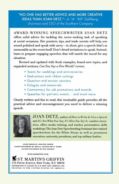 -Your alma mater asks you to say a few words at an upcoming fundraising dinner -You've won an employee award and will have to give a short acceptance speech at the ceremony -Your parents are celebrating their 50th anniversary, and you'd like to make a toast at their party Everyone's counting on you to sound polished, to be prepared, to speak with savvy-in short, to give a speech that's as memorable as the occasion itself. Don't dread these invitations to speak. Instead, learn to prepare clear, concise, and engaging speeches that will live up to your audience's expectations and match the mood of the occasion. Award-winning corporate speechwriter Joan Detz offers solid advice for tackling this nerve-racking task-with pointers, tips, and trade secrets that will help you make the most of every speaking opportunity. Clearly written and fun to read, this invaluable guide provides all the practical advice and encouragement you need to deliver a winning speech.