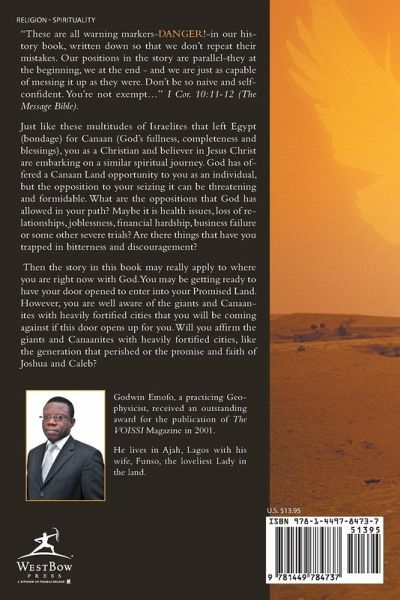 "These are all warning markers-DANGER!-in our history book, written down so that we don't repeat their mistakes. Our positions in the story are parallel-they at the beginning, we at the end - and we are just as capable of messing it up as they were. Don't be so naive and self-confident. You're not exempt..." I Cor. 10:11-12 (The Message Bible). Just like these multitudes of Israelites that left Egypt (bondage) for Canaan (God's fullness, completeness and blessings), you as a Christian and believer in Jesus Christ are embarking on a similar spiritual journey. God has offered a Canaan Land opportunity to you as an individual, but the opposition to your seizing it can be threatening and formidable. What are the oppositions that God has allowed in your path? Maybe it is health issues, loss of relationships, joblessness, financial hardship, business failure or some other severe trials? Are there things that have you trapped in bitterness and discouragement? Then the story in this book may really apply to where you are right now with God. You may be getting ready to have your door opened to enter into your Promised Land. However, you are well aware of the giants and Canaanites with heavily fortified cities that you will be coming against if this door opens up for you. Will you affirm the giants and Canaanites with heavily fortified cities, like the generation that perished or the promise and faith of Joshua and Caleb?