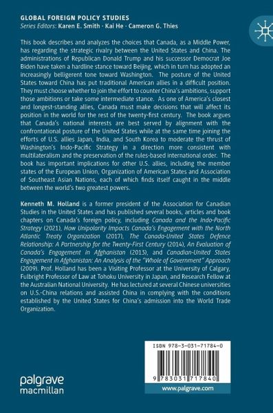 This book describes and analyzes the choices that Canada, as a Middle Power, has regarding the strategic rivalry between the United States and China. The administrations of Republican Donald Trump and his successor Democrat Joe Biden have taken a hardline stance toward Beijing, which in turn has adopted an increasingly belligerent tone toward Washington. The posture of the United States toward China has put traditional American allies in a difficult position. They must choose whether to join the effort to counter China's ambitions, support those ambitions or take some intermediate stance. As one of America's closest and longest-standing allies, Canada must make decisions that will affect its position in the world for the rest of the twenty-first century. The book argues that Canada's national interests are best served by alignment with the confrontational posture of the United States while at the same time joining the efforts of U.S. allies Japan, India, and South Korea to moderate the thrust of Washington's Indo-Pacific Strategy in a direction more consistent with multilateralism and the preservation of the rules-based international order. The book has important implications for other U.S. allies, including the member states of the European Union, Organization of American States and Association of Southeast Asian Nations, each of which finds itself caught in the middle between the world's two greatest powers.