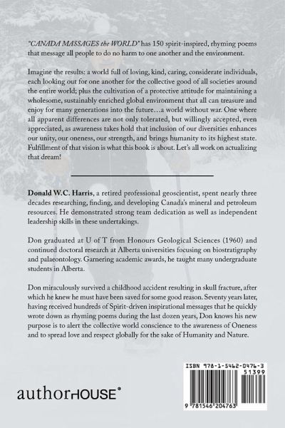 "CANADA MASSAGES the WORLD" has 150 spirit-inspired, rhyming poems that message all people to do no harm to one another and the environment. Imagine the results: a world full of loving, kind, caring, considerate individuals, each looking out for one another for the collective good of all societies around the entire world; plus the cultivation of a protective attitude for maintaining a wholesome, sustainably enriched global environment that all can treasure and enjoy for many generations into the future…a world without war. One where all apparent differences are not only tolerated, but willingly accepted, even appreciated, as awareness takes hold that inclusion of our diversities enhances our unity, our oneness, our strength, and brings humanity to its highest state.Fulfillment of that vision is what this book is about. Let's all work on actualizing that dream!