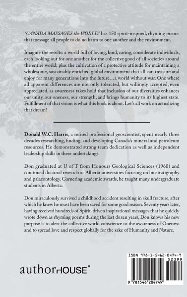 "CANADA MASSAGES the WORLD" has 150 spirit-inspired, rhyming poems that message all people to do no harm to one another and the environment. Imagine the results: a world full of loving, kind, caring, considerate individuals, each looking out for one another for the collective good of all societies around the entire world; plus the cultivation of a protective attitude for maintaining a wholesome, sustainably enriched global environment that all can treasure and enjoy for many generations into the future…a world without war. One where all apparent differences are not only tolerated, but willingly accepted, even appreciated, as awareness takes hold that inclusion of our diversities enhances our unity, our oneness, our strength, and brings humanity to its highest state.Fulfillment of that vision is what this book is about. Let’s all work on actualizing that dream!